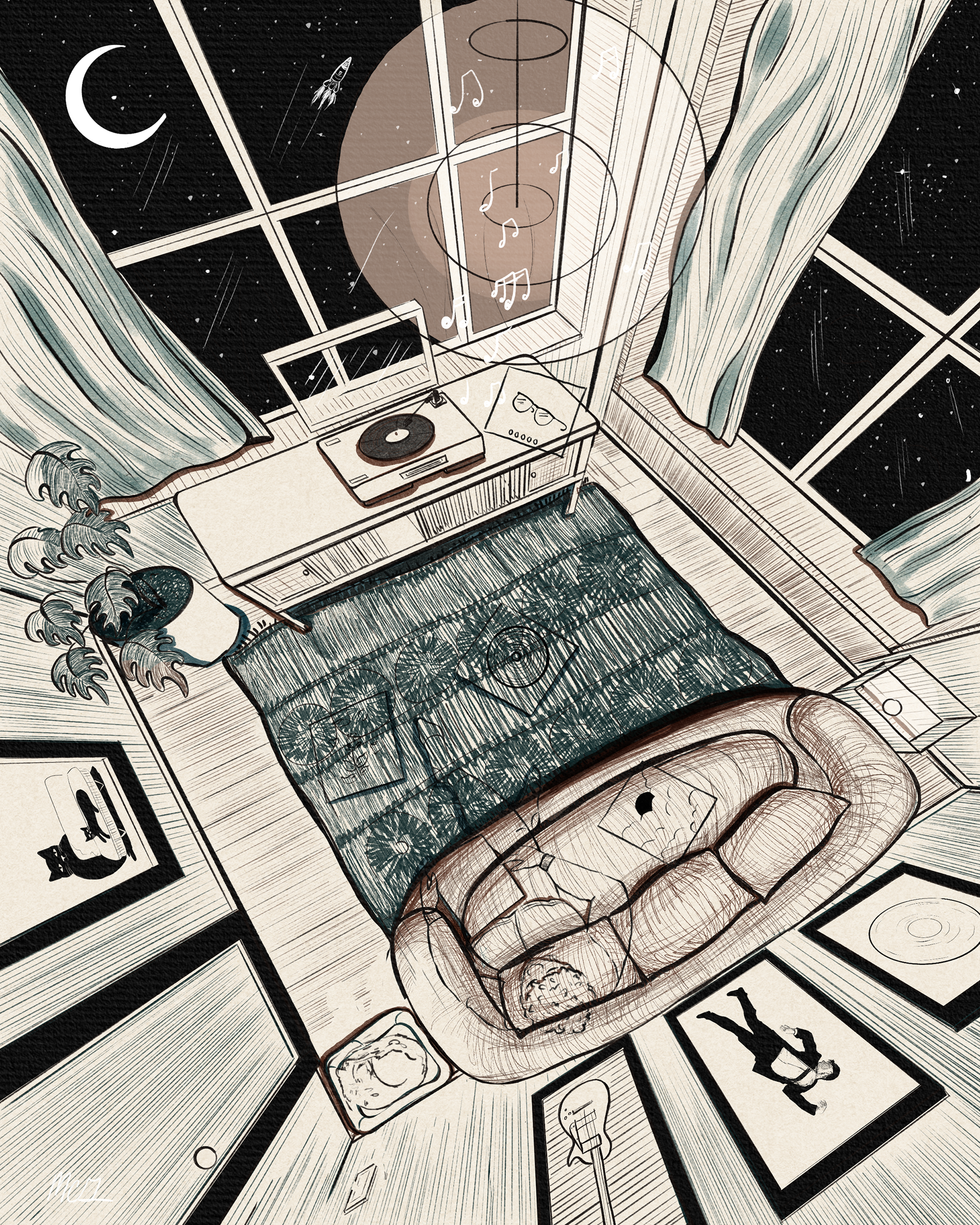"The Record Room" - Black and White Ink Drawing - 2025
